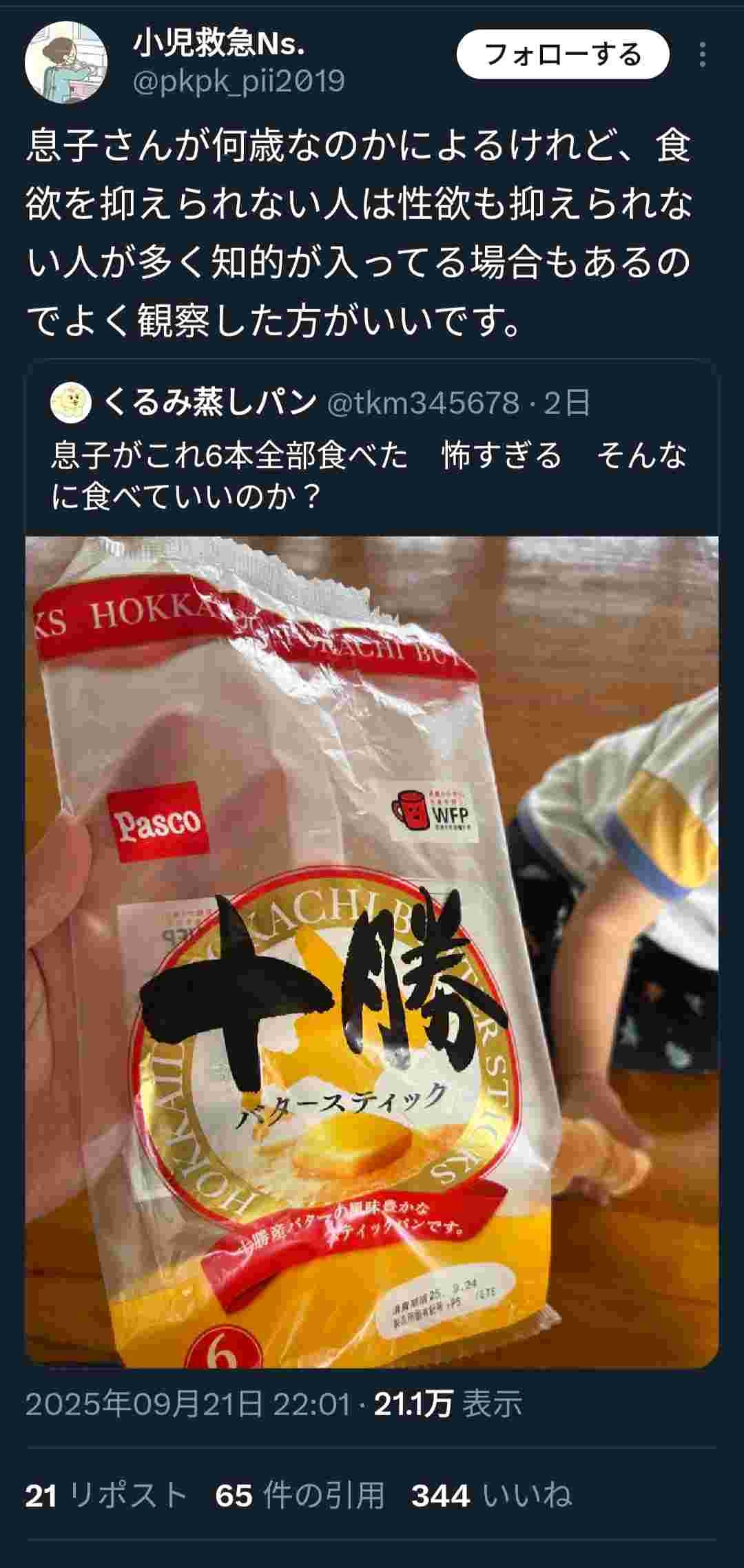 母親「息子がスティックパン6本も食べちゃった」→ナース「食欲も性欲も制御できない知的障害かもわからんですね」