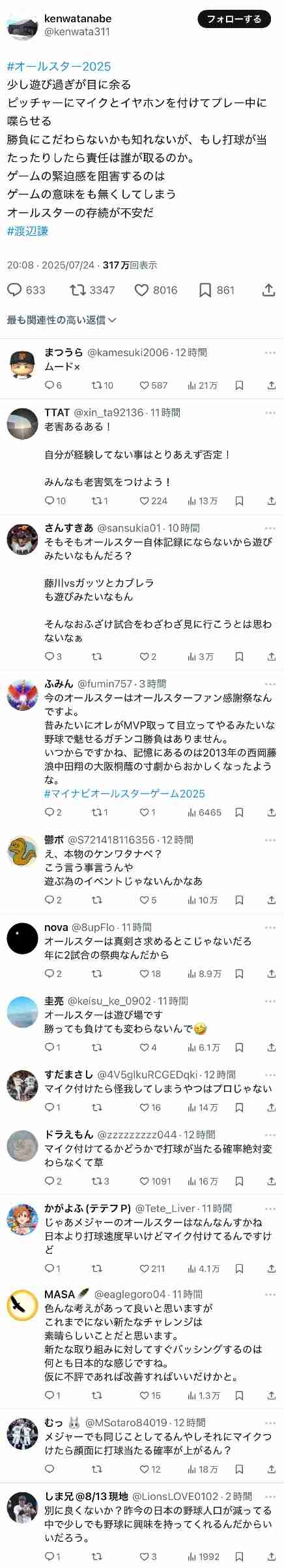 渡辺謙が苦言「最近のプロ野球のオールスター、遊びすぎ」→批判殺到大炎上🔥