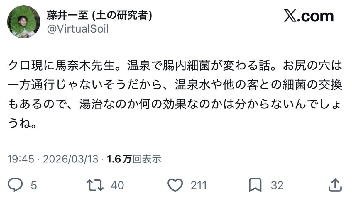 温泉に入ると腸内細菌が変わると判明。おっさん同士でうんこ水の交換か?