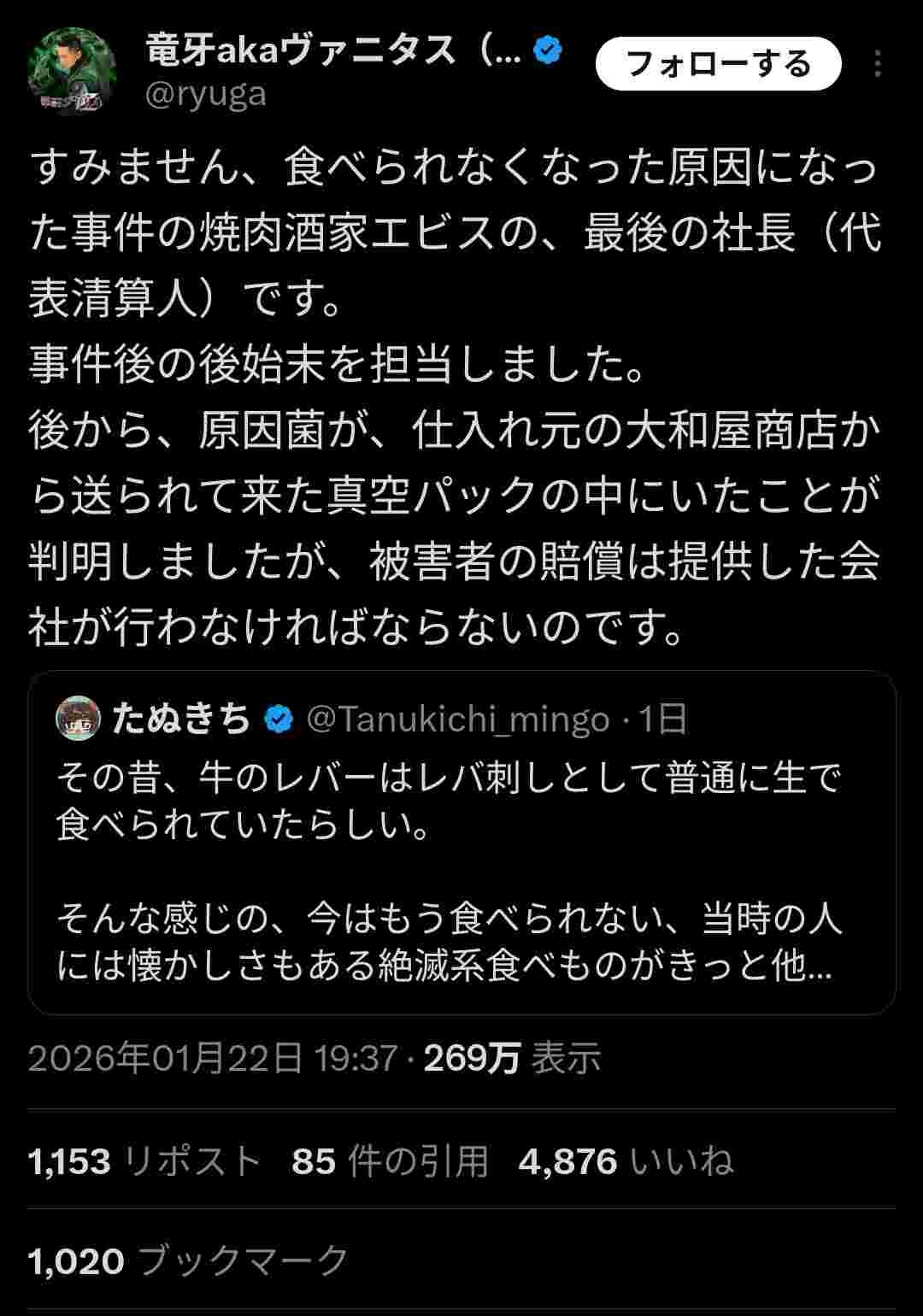 牛レバーで死人を出し規制のきっかけとなった焼肉エビス、ガチのマジで無罪でただの被害者だったwww
