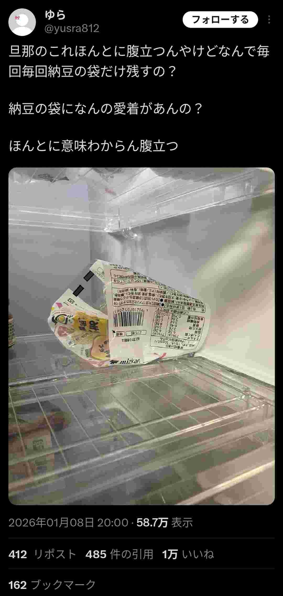 男さん、納豆の袋だけを冷蔵庫残し炎上www
