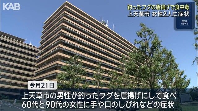 熊本県によると、21日、上天草市の男性が釣ったフグを唐揚げにして食べた親族の60代と90代の女性に、手や口のしびれなどの症状が出ました。