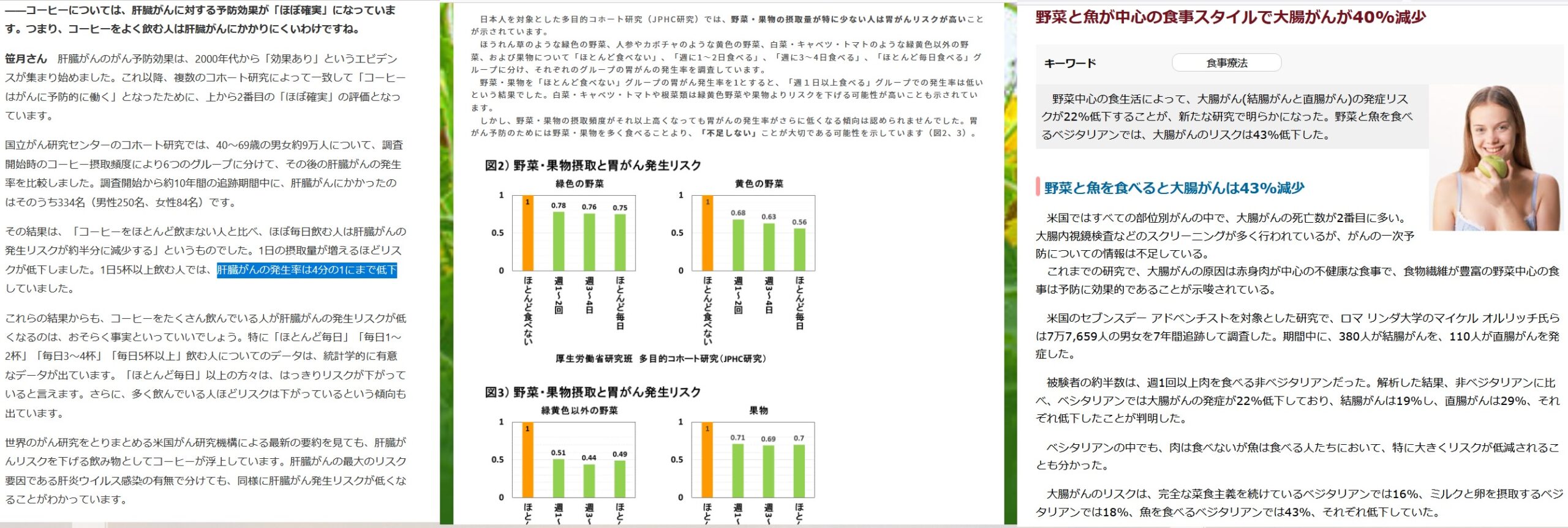 癌リスク。果物を食べると30%減。魚を食べると43%減。コーヒー飲むと75%減。
