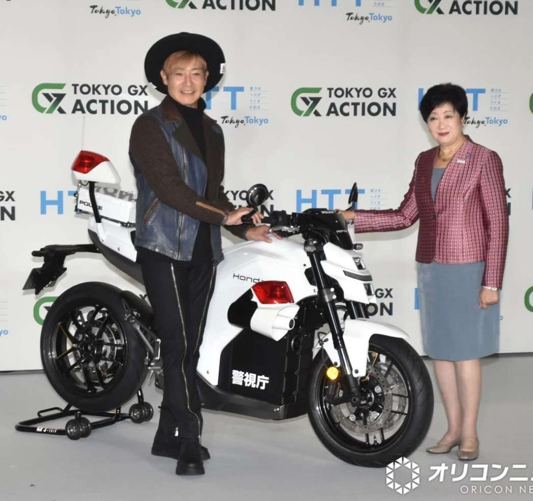 白バイ仕様の国産EVバイク、初公開される。来年1月の箱根駅伝で使用予定。セレモニーにはつるの剛士、小池百合子知事が参加
