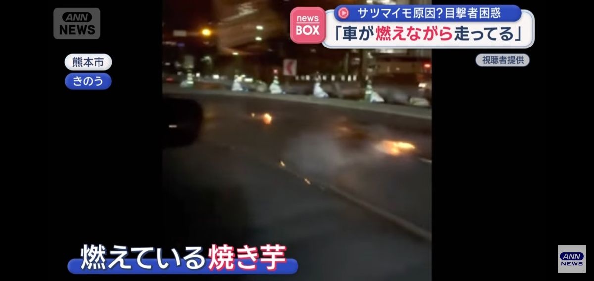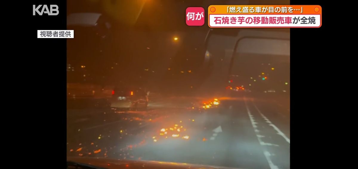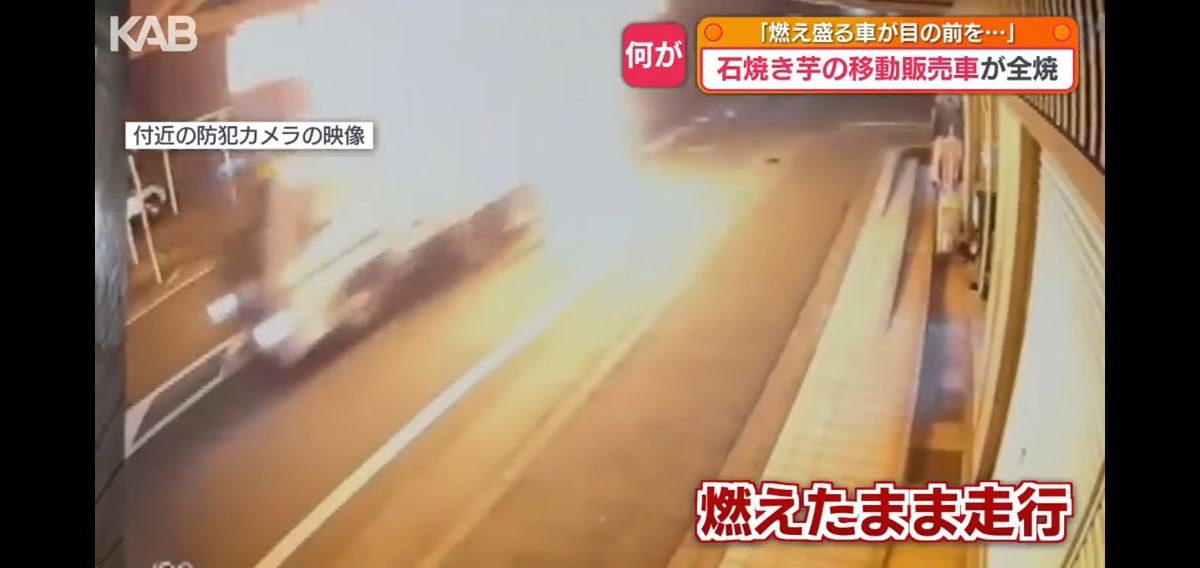 石焼き芋の販売トラック、車ごと焼きながら燃えたサツマイモを道路にばら撒き街を爆走する