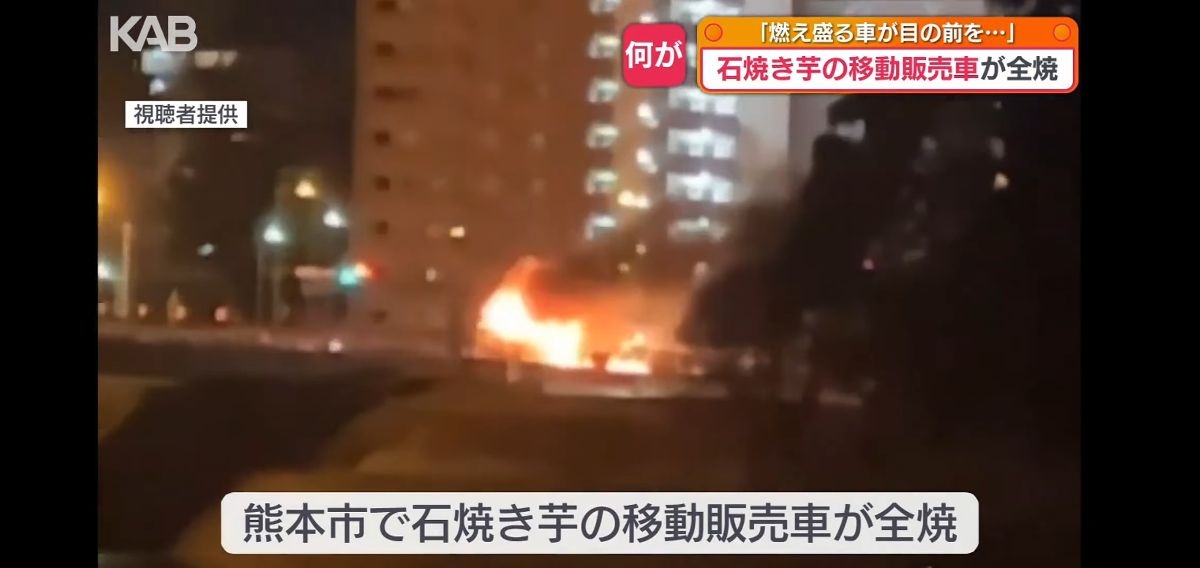 消防と警察によりますと、熊本市の繁華街で石焼き芋などを販売する移動販売のトラックから出火し、トラックは炎上しながら水道町方面から代継橋付近を走行。