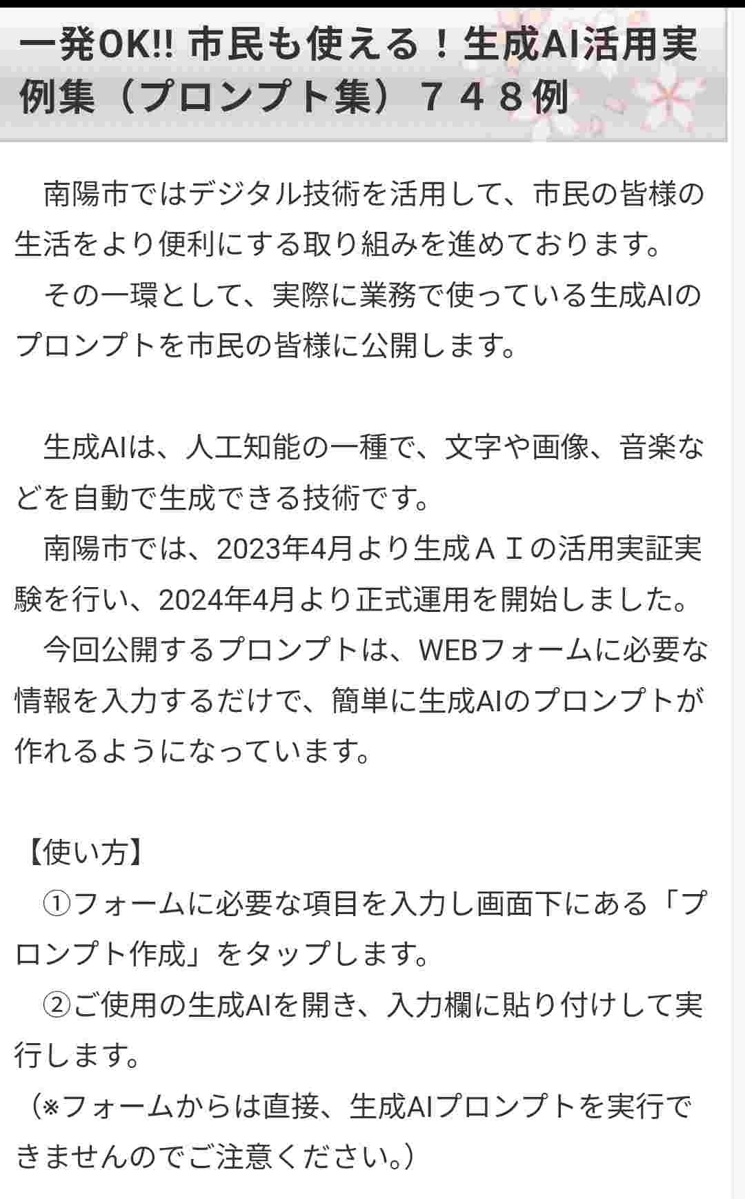 一発OK!! 市民も使える!生成AI活用実例集(プロンプト集)748例自治体で生成AIを導入したい方へ。具体的な生成AI活用事例をご紹介。業務効率化に役立つ情報を提供します。www.city.nanyo.yamagata.jp