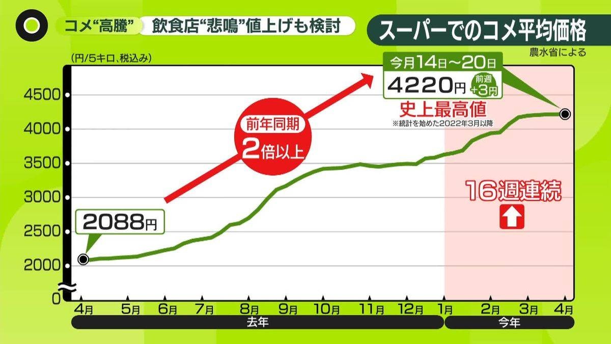 - 28日、農林水産省が発表した全国のスーパーでのコメ5キロあたりの平均価格は前の週から3円上がり、4220円に。16週連続で値上がりし、史上最高値を更新しました。この価格は、去年の同じ時期の2倍以上です。
