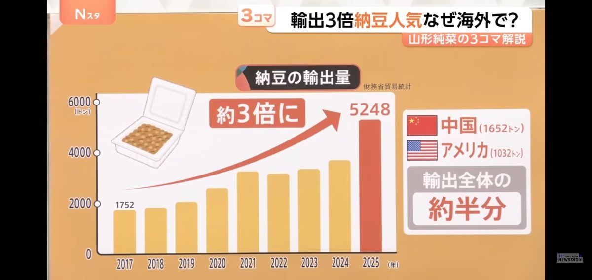 - 今や世界で受け入れられている納豆。その輸出量の推移を見ると、2025年は5248トンで、2017年(1752トン)に比べて約3倍に急増しています。(財務省貿易統計より)
