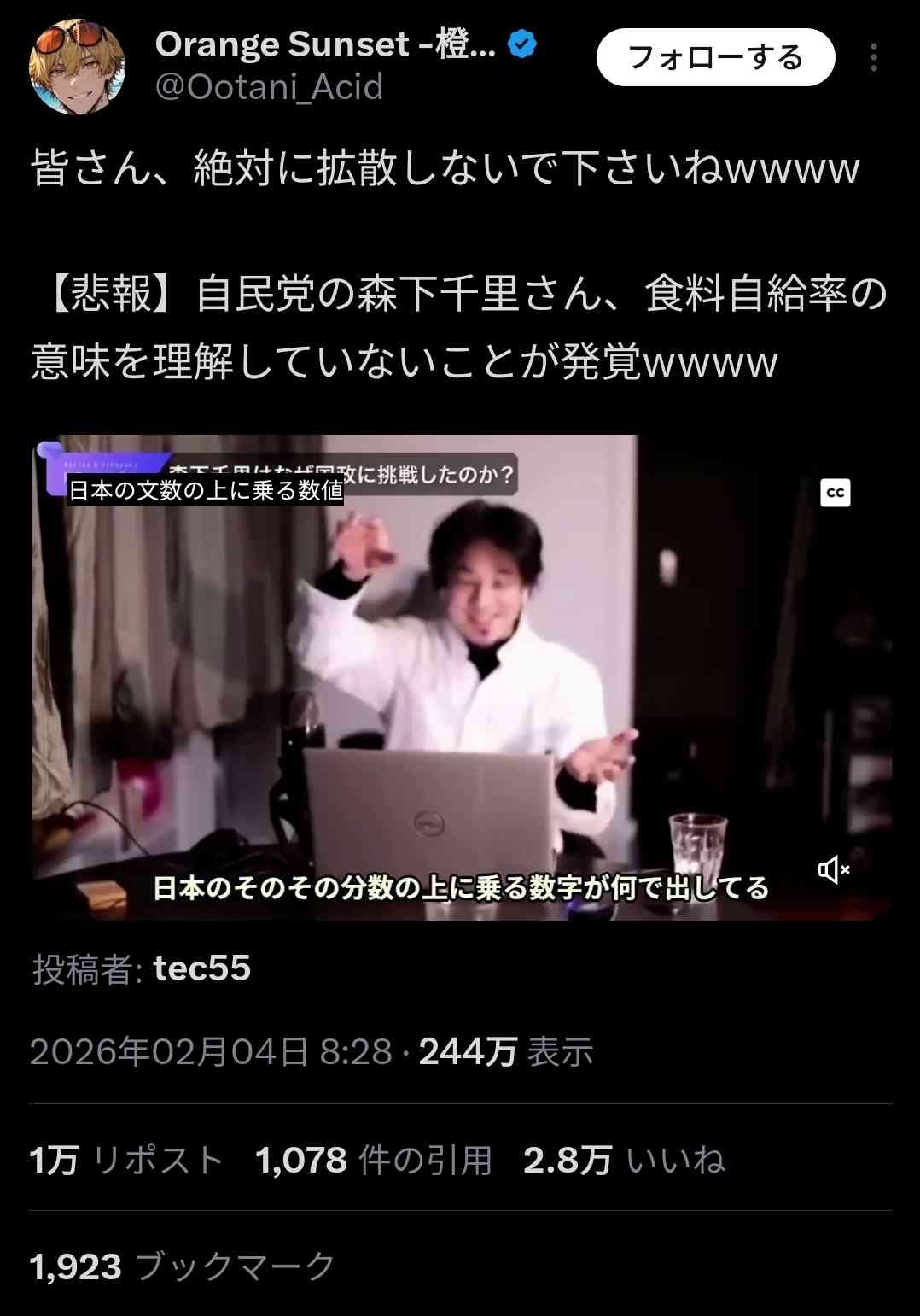 - 食料自給率も知らない森下みたいなのが自民党議員やってる地獄よ