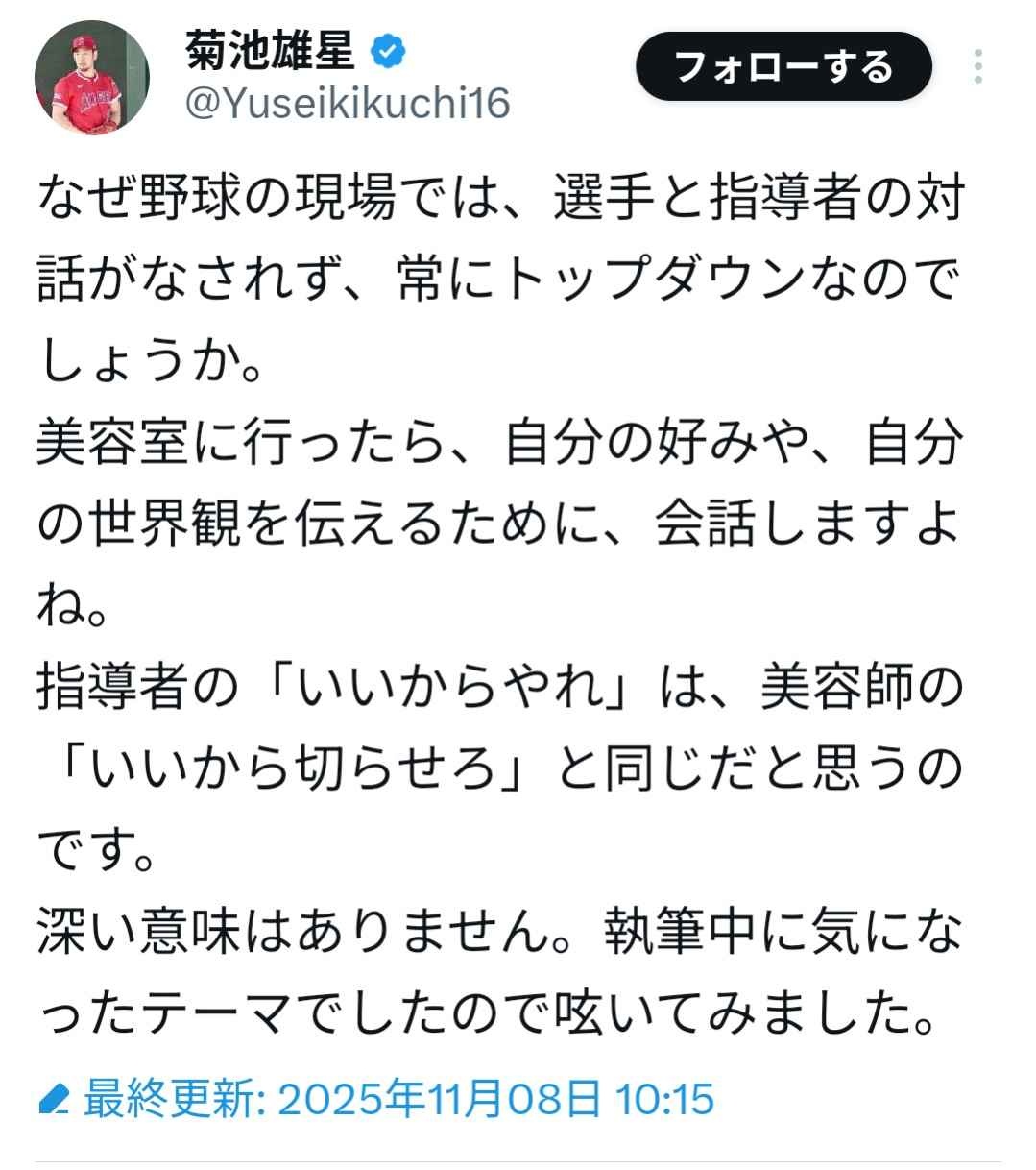 菊池雄星さん、指導のあり方に物申すも野球の指導者を美容師に例えてちょっと何言ってる分からない
