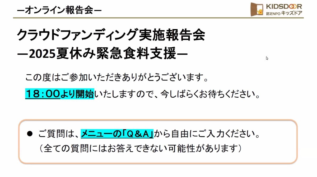 認定NPO法人キッズドア「2025夏休み緊急食料支援」実施報告会 18:00〜