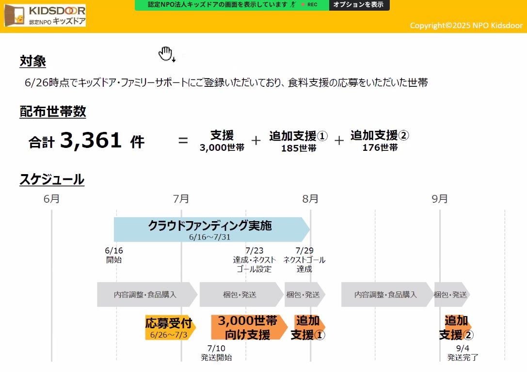 当日はこちらの追加支援も含めまして、以下の通りにご報告いたします。【内 容】 クラウドファンディング実施報告会 ―2025夏休み緊急食料支援―