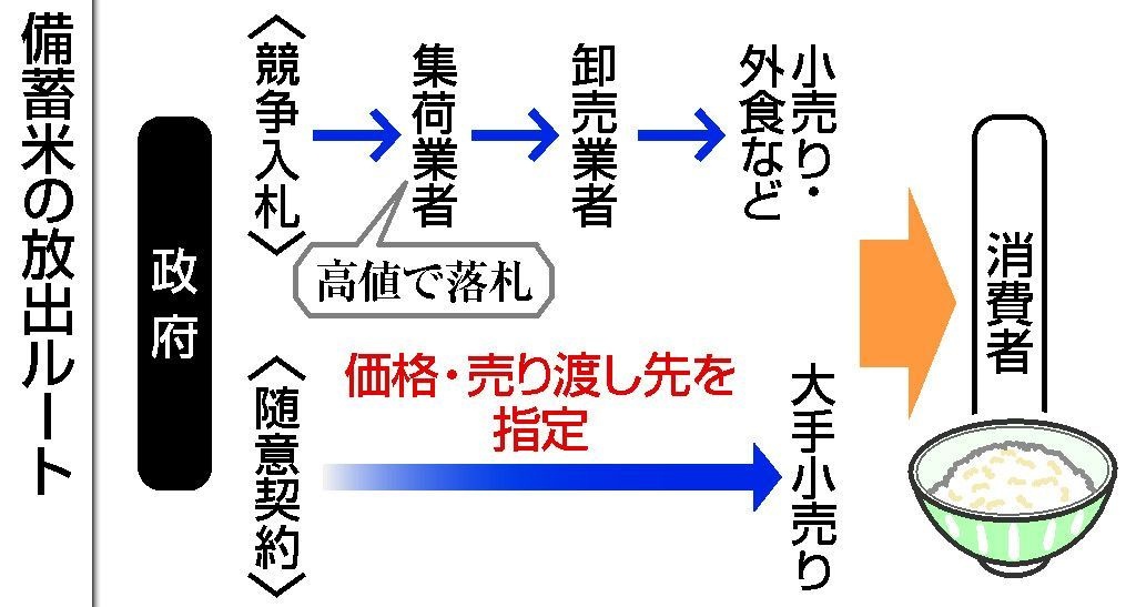 >農林水産省は26日、随意契約を通じて放出する政府備蓄米について、玄米60キロ当たり平均1万1556円で大手小売業者に売り渡すと発表した。>高騰したコメの価格を引き下げるためにこれまでの競争入札による放出時の半額程度に抑え、店頭に5キロ当たり2000円程度で備蓄米が並ぶと見込んでいる。