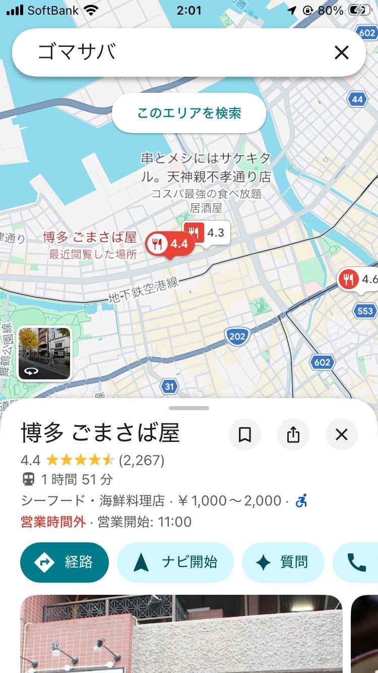 昼にひらお行って夜は時間と場所の都合でこのごまさば屋ってとこにしようと思うんやがここでええやろうか