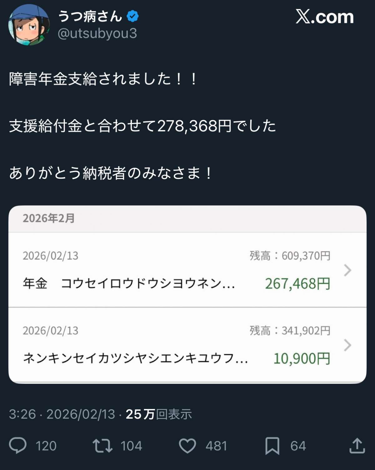 障害年金の話題だと流されないエッヂ民 - 19 : 2026/02/13(金) 17:31:53.190 ID:u2bxIbLJY