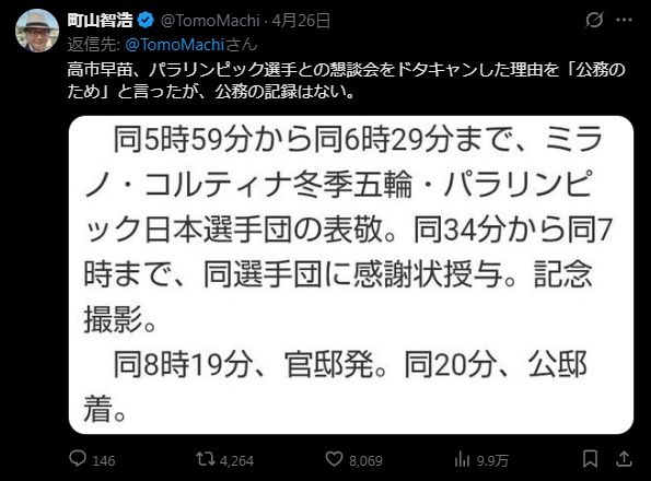 高市早苗、五輪パラリンピック選手との懇談会をドタキャンした理由を「公務のため」と言ったが、公務の記録はない。 - 2 : 2026/04/28(火) 10:04:31.31 ID:UqvhjX1v0