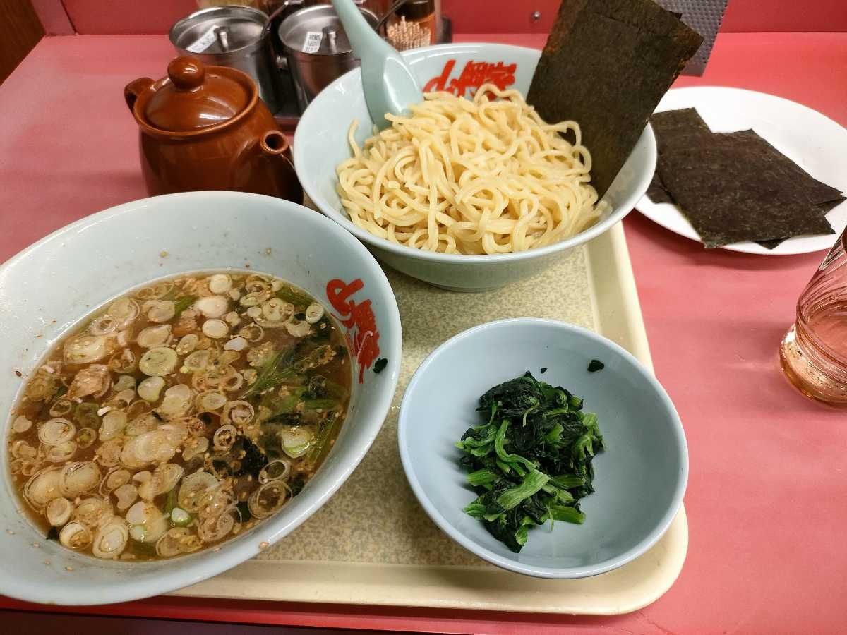 醤油つけ麺に無料クーポンの海苔とほうれん草