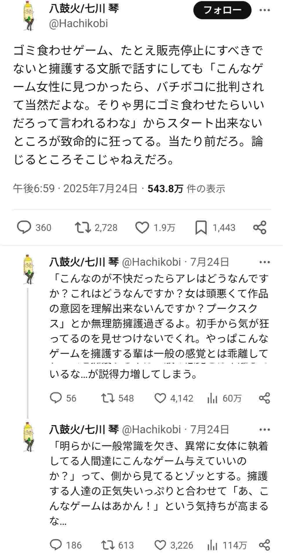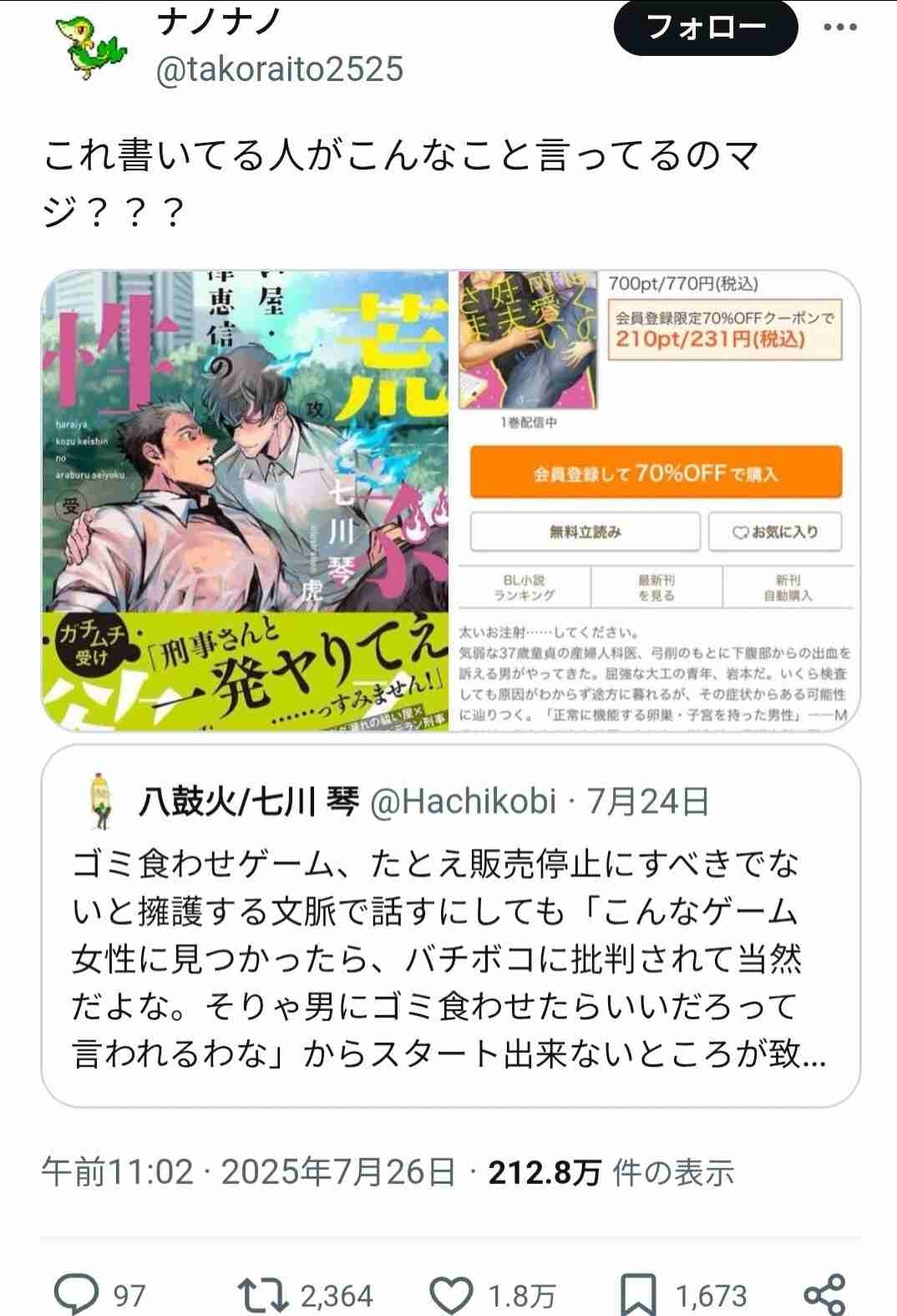 BL作家「女性の身体に執着してる人にこんなゲーム与えるな販売停止しろ」 X民「こんな作品書いてる人が言うことか?」