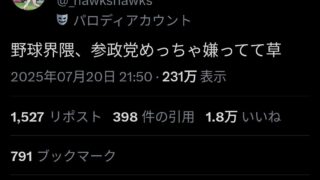 エッヂネット民「野球界隈、参政党めちゃくちゃ嫌っててくさ」→10万いいねwww