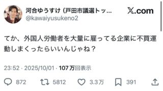 エッヂ普通の日本人、気づく「外国人を大量に雇ってる企業に不買運動すればいいんじゃね?」←10万いいねwww