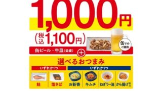 嫌儲吉野家「吉呑みセット(1,100円)」が発売。缶ビール1本+牛皿+鮭or塩サバ+おつまみ1品で1,100円のコスパ最強セット