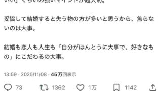 嫌儲【高市悲報】女性インフルエンサー「若い女性の皆さんは「100%満足いく男じゃないなら一生独身でいい」くらいの強い心が超大切」