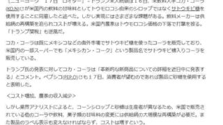 嫌儲トランプ、コカ・コーラ甘味料変更でトウモロコシ価格下落、農家収入減少によって全米地域社会に重大な経済的影響を引き起こす