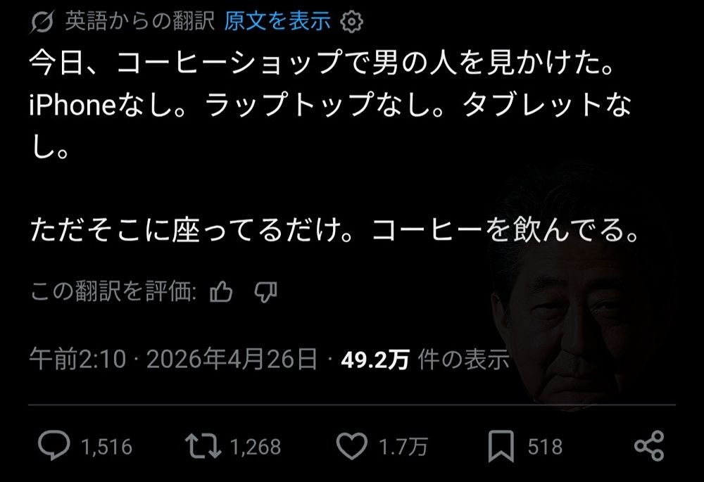 俺ならたまにはスマホ触らないでゆっくりコーヒー楽しむのもいいなぁ、という意味にとる - 56 : 2026/04/26(日) 10:23:34.62 ID:fC9PU1xH0