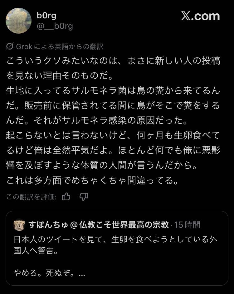 X民「生卵を食べれるのは日本だけ!日本以外で食べたら死ぬぞ!」10万いいね←ガチで馬鹿にされるwww