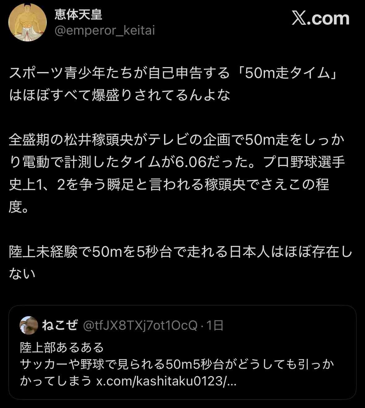 - 存在価値が何m何秒しかないからこんな食ってかかるんやろうけど50m走のタイムなんか他のスポーツやと割とどうでもええからな