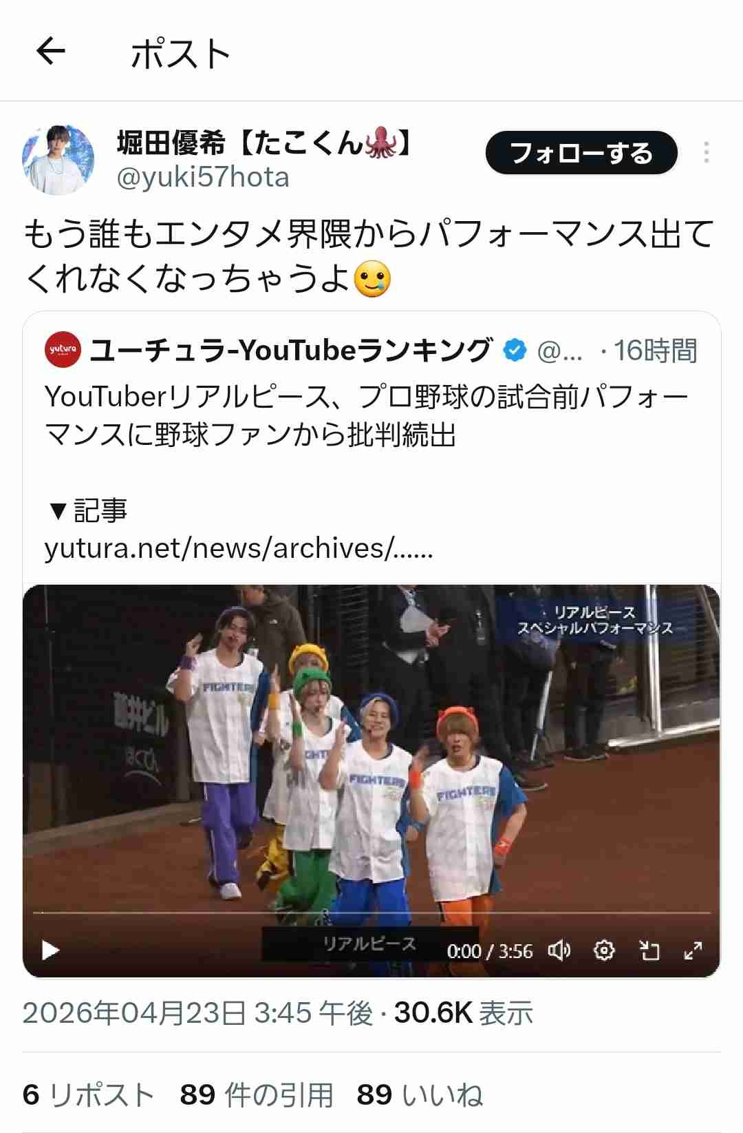 YouTuber「野球場に来るYouTuber批判してたらもう誰もエンタメ界隈からパフォーマンス出てくれなくなっちゃうよ🥲」