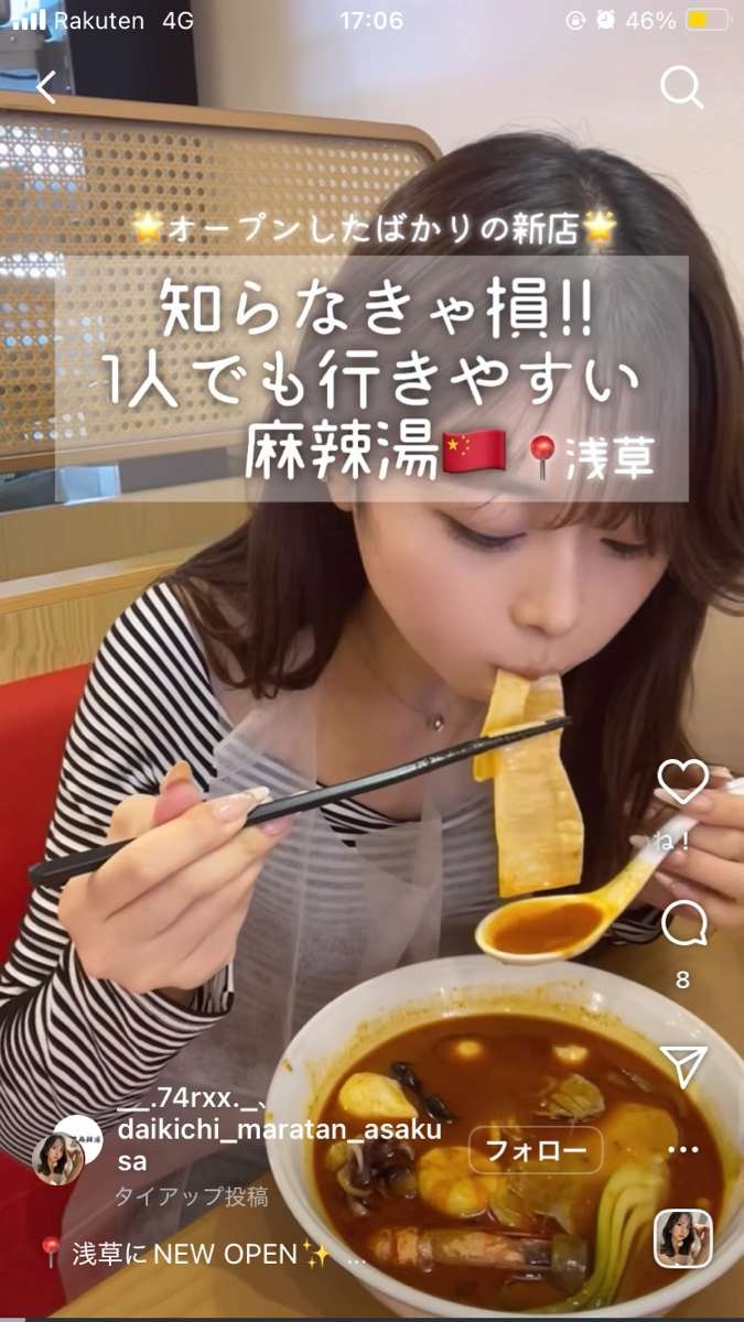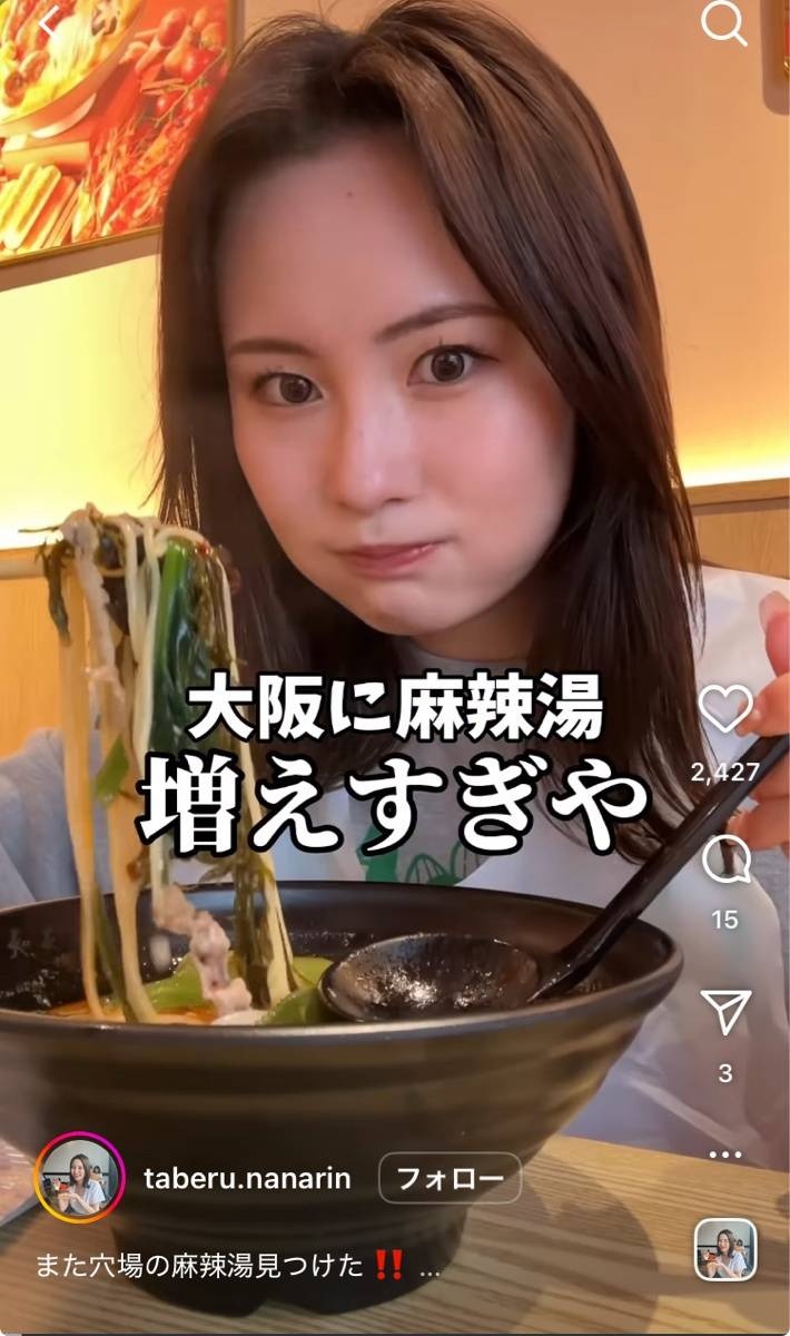日本の若者の間でマーラータンがブーム化したのは2024年。10~20代の女性TikTokerやインスタグラマー、YouTuberがマーラータンを食べる動画を投稿し始め、注目されるようになった。食レポ動画内で「行列1時間待ちのマーラータンの店に食べに来た!」というような表現をする投稿者も多く、それを見てチェーン店の楊國福や七宝などに通う女性が増える、その様子がSNSで拡散し人気に拍車をかけるという循環になっている。